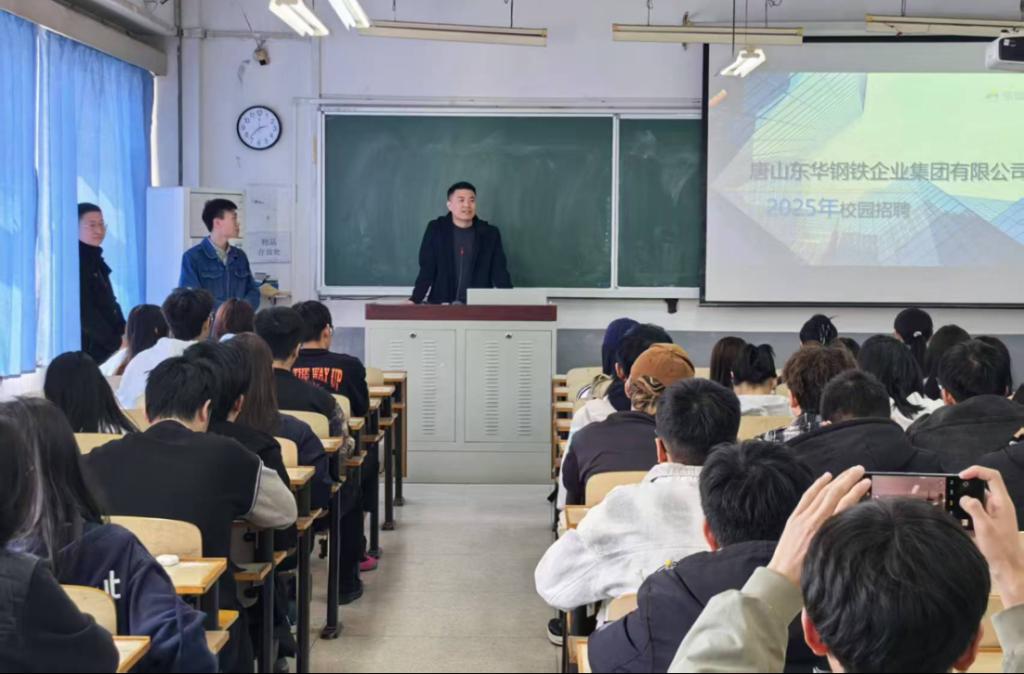 为深入贯彻国家促进高校毕业生高质量充分就业的政策方针,积极推动教育与产业的深度融合,2025年4月1日下午,vsport官方网站与唐山东华钢铁集团有限公司联合,在2304教室举办了招聘宣讲会。vsport官方网站就业指导办公室主任周静芳老师出席本次宣讲会。现场气氛热烈,吸引了2021级100余名员工前来参加,有10余名员工达成就业意向。