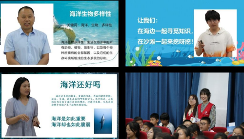 甄文全博士以“保护海洋生物多样性”为主题,以海龟、海马、海牛、海豹、海狮、海象、海鬣蜥、海兔、狮子鱼、小丑鱼、蝴蝶鱼、鲀鱼、鲳、鲻、牙鲆、鲷、扇贝、牡蛎、文蛤、青蛤、毛蚶等向员工们介绍了海洋动物多样性;以金字塔形式导入海洋生物能量传递过程,介绍海洋生物生生不息的内在规律以及全过程生态保护的潜在理念。纪崇霄博士以“认知海洋 呵护蔚蓝”为主题,带领同学认识海洋、海洋重要性、海洋环境现状,传递海洋环境保护理念,启发同学从自己做起、从身边小事做起,多做保护环境和保护海洋的事。老员工志愿者以“海草与海鸟”为题,向同学们介绍了海草的分布、生态作用,以及著名候鸟——东方白鹳在唐山的生存情况,唤起同学们的好奇心和想象力;又以“海洋挖呀挖”歌曲带动同学们体验海洋与海洋生物的魅力。